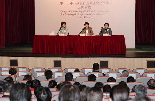 署理政制及內地事务局局长出席二○一二年行政长官及立法会產生办法公开论坛(一) 署理政制及內地事务局局长黄静文(中)今晚(一月十五日)出席二○一二年行政长官及立法会產生办法公开论坛,听取公眾对该两个选举办法的意见。旁为民政事务局副局长许晓暉(右)及民政事务总署署长陈甘美华(左)。
