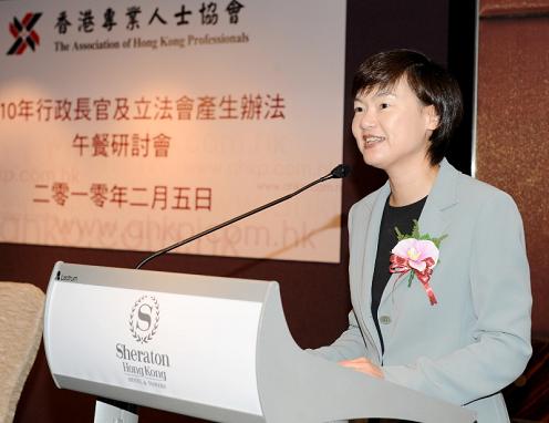 政制及內地事务局副局长出席政制发展研討午餐会(一) 政制及內地事务局副局长黄静文今日(二月五日)下午出席由香港专业人士协会举办的政制发展研討午餐会,听取与会人士就《二零一二年行政长官及立法会產生办法諮询文件》的意见。图示黄静文於午餐会上发言。