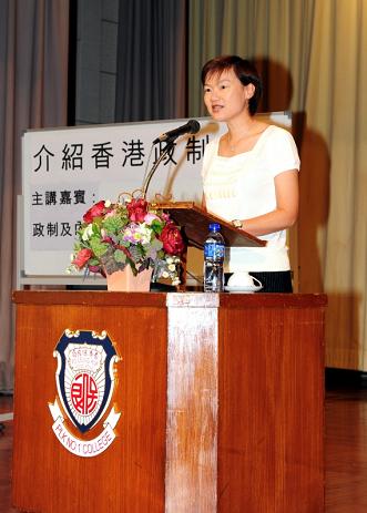 政制及內地事务局副局长到访保良局第一张永庆中学(一) 政制及內地事务局副局长黄静文今日(五月二十六日)就政制发展与保良局第一张永庆中学学生进行交流。图示黄静文向学生介绍政府在上月推出的《二零一二年行政长官及立法会產生办法建议方案》。