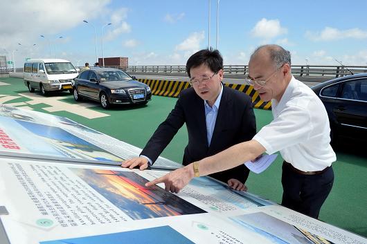 政制及內地事务局局长继续访问上海(一) 图示林瑞麟今日(八月二十日)上午参观洋山深水港时,聆听职员有关东海大桥的介绍。