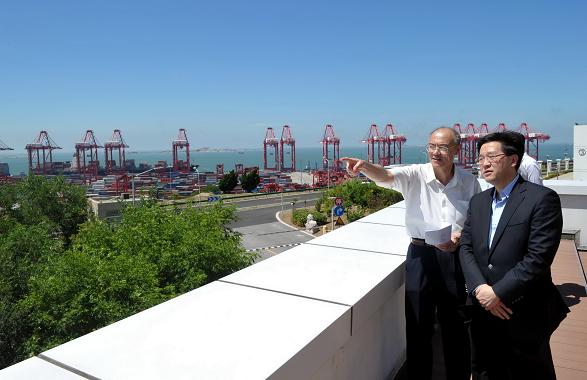 政制及內地事务局局长继续访问上海(二) 图示林瑞麟今日(八月二十日)上午参观洋山深水港时,听取职员讲解集装箱港区的运作情况。