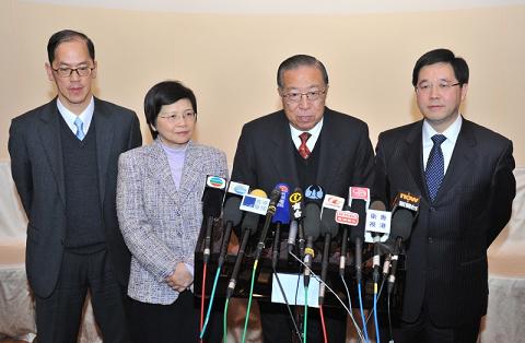 「港台经济文化合作协进会」宴请访港「台港经济文化合作策进会」(二) 「协进会」主席李业广(右二)联同「协进会」常务副主席政制及內地事务局局长林瑞麟(右),以及两位「协进会」副主席──商务及经济发展局局长刘吴惠兰(左二)和民政事务局局长曾德成(右)於午宴后会见传媒。 |