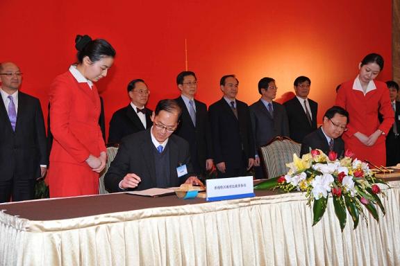 沪港经贸合作会议第二次会议在上海举行(三) 香港医院管理局主席胡定旭(左)与上海申康医院发展中心代表在曾荫权、韩正和一眾嘉宾见证下,签署合作协议书。