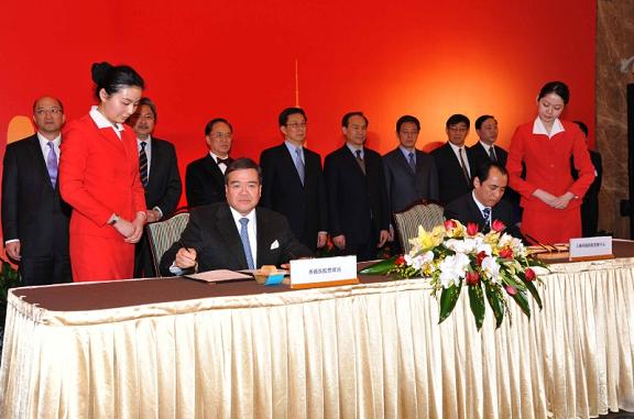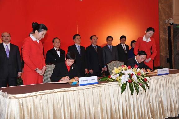 沪港经贸合作会议第二次会议在上海举行(二) 公务员事务局局长俞宗怡(左)和上海市港澳事务办公室代表在曾荫权、韩正和一眾嘉宾见证下,签署两地公务员交流协议。