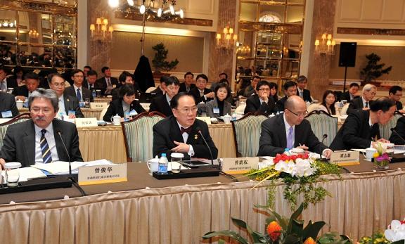 沪港经贸合作会议第二次会议在上海举行(六) 財政司司长曾俊华(左三)在会议上作总结发言。 |
