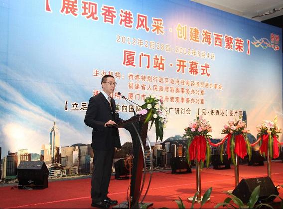 香港驻粤经济贸易办事处(驻粤办)主任朱经文今日(二月二十八日)在厦门推广香港活动的开幕礼上致辞说:「香港特区政府一直重视海峡西岸经济区(海西经济区)的发展,並与其保持非常紧密的联繫。」 朱经文说:「为抓紧海西地区发展的机遇,香港特区政府已经在福州设立『驻福建联络处』。驻福建联络处將致力提升香港与该区在多方面的合作,並协助香港企业在该区把握新的发展机遇。」 他说︰「香港是国际金融、贸易和航运中心,拥有独特的优势,包括完善和公平的法律制度,良好的知识產权保障,高度的资讯自由,先进的电信基建和人才等,可以为海西经济区的企业『走出去』提供支援服务。」 今日的推广活动是由驻粤办联同福建省人民政府港澳事务办公室主办及厦门市人民政府港澳事务办公室承办,活动包括有「立足香港.迈向国际」投资推广研討会及「见.识香港」图片展。 另外,驻粤办亦將於三月在福建多个城市举办「见.识香港」图片展,向当地市民介绍香港各方面的发展情况。 完 2012年2月28日(星期二)