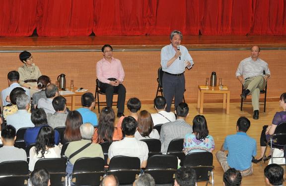財政司司长曾俊华及政制及內地事务局局长谭志源今日(七月二日)下午到访旺角街坊会陈庆社会服务中心礼堂听取市民意见及诉求。一同出席的还有油尖旺区议会主席钟港武 (左二) 及油尖旺民政事务专员郭黄颖琦 (左一)。 |