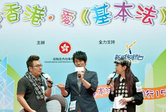 爱香港.爱《基本法》同乐日2012(五) 歌手许廷鏗(左)与现场观眾一同参与《基本法》游戏环节,与眾同乐。 |