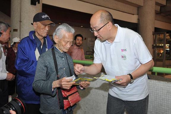 政制及內地事务局局长参与「全城清洁运动」(二) 谭志源(右)向市民派发清洁用品包。 |