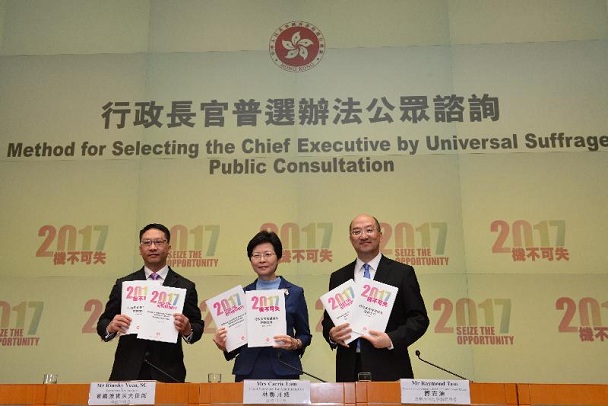 行政长官普选办法公眾諮询记者会(一) 政务司司长林郑月娥(中)、律政司司长袁国强资深大律师(左)和政制及內地事务局局长谭志源(右)今日(一月七日)下午在政府总部主持行政长官普选办法公眾諮询记者会。
