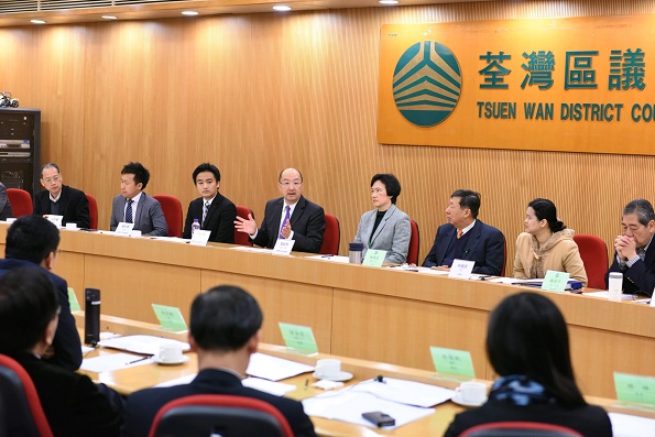 政制及內地事务局局长出席荃湾区议会会议 政制及內地事务局局长谭志源(右五)今日(二月十七日)在荃湾区议会会议上介绍《行政长官普选办法諮询文件》,並听取议员的意见。 |