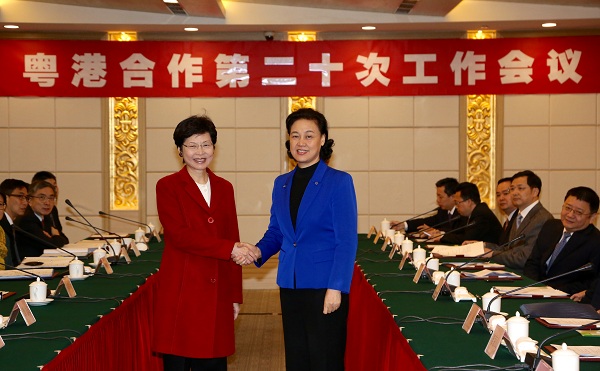 政务司司长林郑月娥今日(三月十一日)与广东省副省长招玉芳在广州共同主持粤港合作联席会议第二十次工作会议。特区政府相关官员和广东省政府有关部门负责人出席了会议。 政务司司长会上说:「於去年十一月举行的第十七次粤港合作联席会议,行政长官和广东省省长率领粤港双方代表团,就双方合作重点达成共识,同意在二○一四年粤港率先基本实现服务贸易自由化的基础上,爭取进一步全面落实两地的服务贸易自由化,並加强在金融、专业服务、跨境基建、旅游、环境保护、文化等各方面的合作。按照这个共识,双方在各个相关范畴合力编制了《2015年重点工作》,当中的合作项目达90项。粤港双方会积极推进相关的重点工作。」 有关个別合作范畴的进展和合作方向如下:
