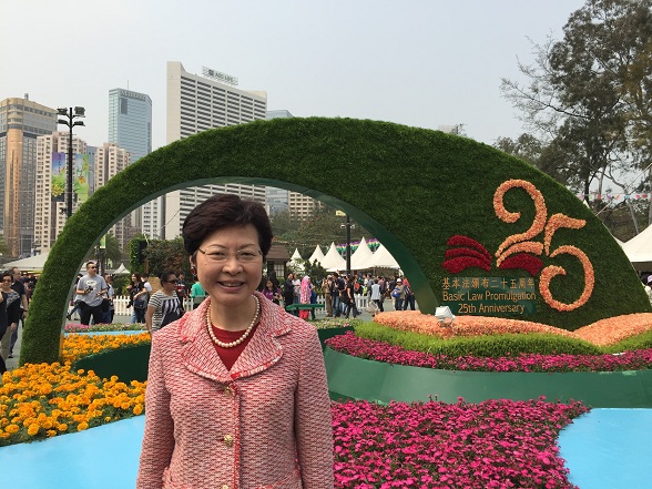 庆祝《基本法》颁布25周年活动 政务司司长林郑月娥摄於香港花卉展览內「《基本法》颁布25周年」园圃前。 |