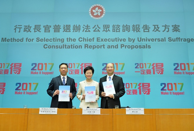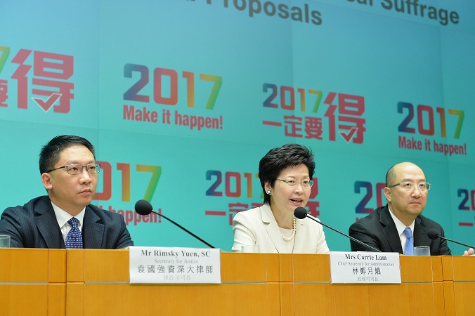 《行政长官普选办法公眾諮询报告及方案》记者会(一) 政务司司长林郑月娥(中)、律政司司长袁国强资深大律师(左)和政制及內地事务局局长谭志源(右)今日(四月二十二日)下午在政府总部主持《行政长官普选办法公眾諮询报告及方案》记者会 。
