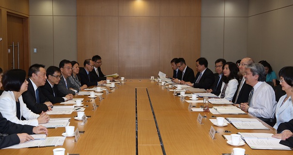 財政司司长曾俊华(右二)今日(七月十七日)与澳门特別行政区经济財政司司长梁维特(左二)在香港共同主持第八次港澳合作高层会议。 |
