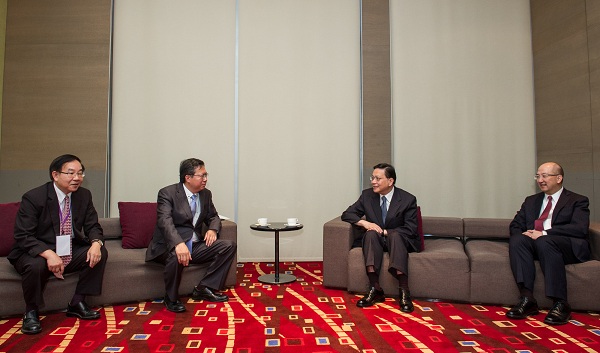运输及房屋局局长张炳良教授(右二)和政制及內地事务局局长谭志源(右一)今日(八月六日)在桃园出席「2015香港桃园城市交流论坛」前与桃园巿市长郑文灿(左二)和副市长王明德(左一)会面,就共同关心的议题交换意见。