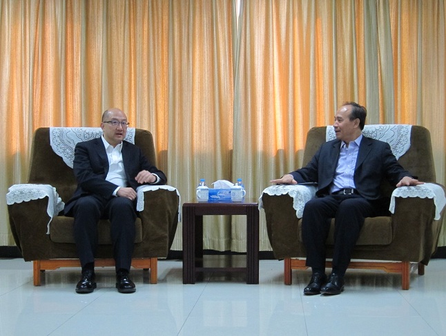 由政制及內地事务局局长谭志源率领的特区政府代表团今日上午(十月十四日)继续於北京的访问行程,並在上午到访国务院港澳事务办公室(港澳办)。图示谭志源(左)与港澳办副主任周波就「十三五」规划和「一带一路」事宜交换意见。 |