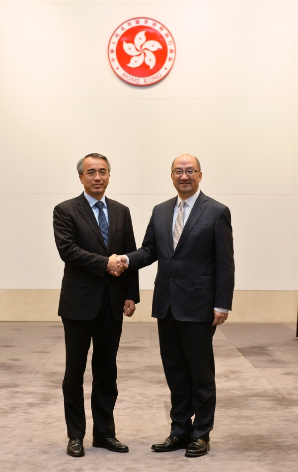 政制及内地事务局局长谭志源和广州市副市长蔡朝林今日(十二月十七日)在添马政府总部共同主持穗港合作专责小组第三次会议。图示谭志源(右)在会议前与蔡朝林握手。