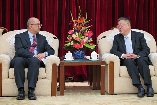 谭志源(左)今日下午与上海市政府副秘书长俞北华会面,就沪港合作及两地最新发展交换意见。 |