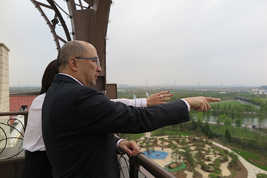 政制及内地事务局局长谭志源今日(四月二十日)上午参观上海迪士尼度假区。图示谭志源听取工作人员介绍园区的建设。
