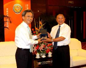 政制及內地事务局常任秘书长在南寧出席泛珠三角论坛 政制及內地事务局常任秘书长罗智光今日(六月十一日)出席在广西南寧举行的「第五届泛珠三角省会(首府)城巿巿长论坛」。图示罗智光在参加论坛后与南寧巿委书记车荣福会面时,双方交换礼物。 |