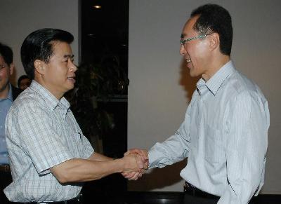 政務司司長宴請廣東省省長 政務司司長唐英年今日(八月一日)在沙田賽馬會設宴款廣東省省長黃華華。黃省長今日抵港,明日將出席粵港合作聯席會議第十次會議。圖示唐英年迎接黃華華。