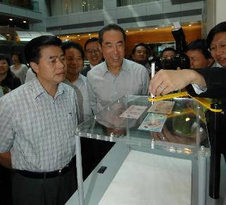 廣東省省長訪問香港生產力促進局 廣東省省長黃華華在香港生產力促進局試驗一項先進儀器。 |