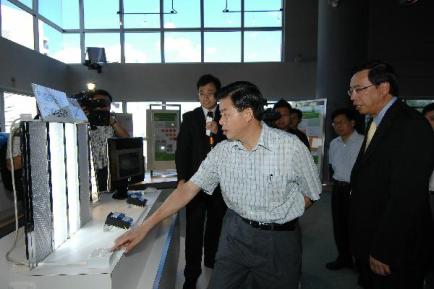 政務司司長與廣東省省長到訪香港科學園 政務司司長唐英年與廣東省省長黃華華今日(八月一日)到訪香港科學園。圖示唐英年與黃華華參觀光電子中心內的產品。