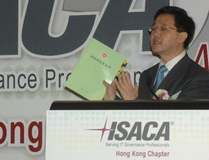 政制及內地事務局局長出席國際資訊系統審計協會週年晚宴 政制及內地事務局局長林瑞麟今日(九月十一日)傍晚出席國際資訊系統審計協會香港分會的二十五週年晚宴,並藉此機會向與會者介紹《政制發展綠皮書》的內容。圖示林瑞麟在晚宴上致辭。 |