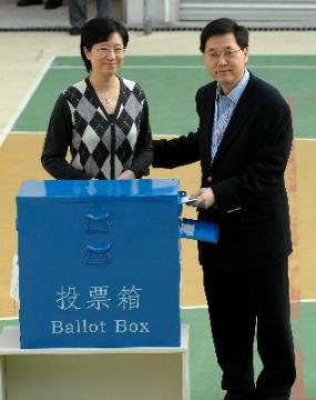 政制及內地事務局局長為二○○七年立法會香港島地方選區補選投票 圖示政制及內地事務局局長林瑞麟今晨(十二月二日)偕同太太在赤柱香港鄭氏宗親總會鄭則耀學校投票站為二○○七年立法會香港島地方選區補選投票。