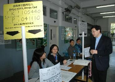 政制及內地事務局局長巡視北角投票站 圖示政制及內地事務局局長林瑞麟今早(十二月二日)巡視北角街坊會陳維周夫人紀念學校投票站,實地了解投票安排。 |