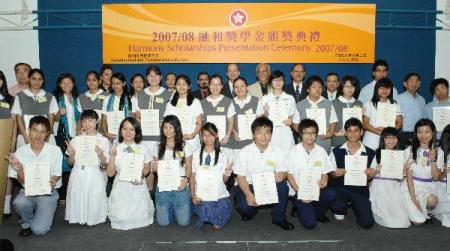 融和獎學金頒獎典禮(一) 圖示融和獎學金小學組得獎者在頒獎典禮上與主禮嘉賓政制及內地事務局副局長譚志源(後排左七)合照。