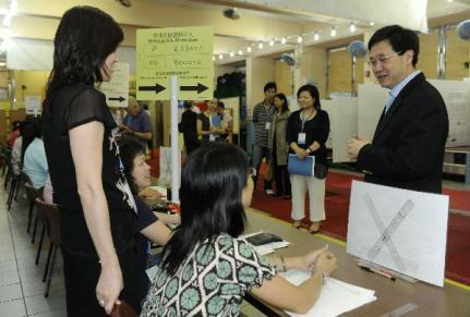 政制及內地事務局局長巡視油尖旺區議會補選投票站 圖示政制及內地事務局局長林瑞麟今日(十月五日)上午巡視油尖旺區議會佐敦東選區補選投票站。 |
