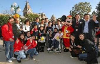 四川災區人士訪港(一) 四川地震災區人士及救災人員組成的訪問團今日(一月十九日)到訪香港迪士尼樂園。圖示訪問團在樂園內合照。
