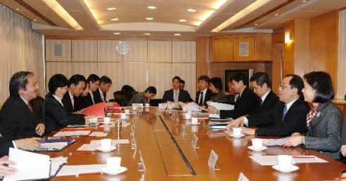 第二次港澳合作會議 財政司司長曾俊華(左)今日(二月九日)與澳門特區經濟財政司司長譚伯源(右二)在香港共同主持第二次港澳合作會議。雙方回顧一直以來港澳合作的成果及討論未來的合作方向。 |