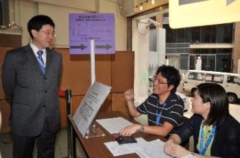 政制及內地事務局局長巡視灣仔區議會補選投票站(二) 政制及內地事務局局長林瑞麟今日(六月二十一日)上午巡視灣仔區議會鵝頸選區補選設於灣仔愛群道鄧肇堅大廈香港童軍總會港島地域的投票站。 |