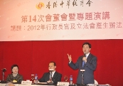 政制及內地事務局局長出席香港中華總商會午餐會(一) 政制及內地事務局局長林瑞麟今日(十二月七日)出席由香港中華總商會舉辦的午餐會,介紹《二零一二年行政長官及立法會產生辦法諮詢文件》,並聽取與會人士對二○一二年兩個選舉辦法的意見。圖示林瑞麟在會上致辭。商務及經濟發展局局長劉吳惠蘭(左)亦有出席午餐會。