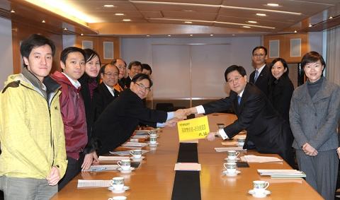 署理政務司司長與民協代表會面(二) 林瑞麟接收民協代表的意見書。旁為政制及內地事務局副局長黃靜文(右)。 |