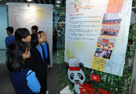 「四川重建--香港項目」巡迴展覽今日起舉行(三) 展覽介紹香港參與四川受地震破壞災區的重建工作,到場參觀的大埔舊墟公立學校學生對展覽深感興趣。