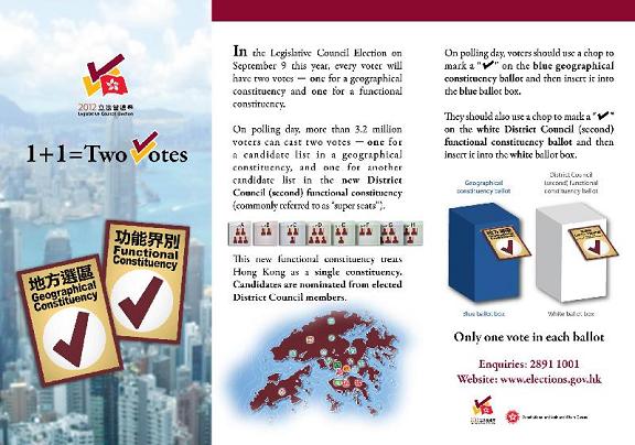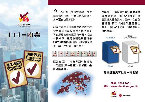 政府推出全新電視宣傳短片介紹立法會選舉投票程序(二) 所有已登記選民會經郵遞收到的區議會(第二)功能界別宣傳單張,它亦已上載至二○一二年立法會選舉網站 (www.elections.gov.hk) 供選民閱覽。