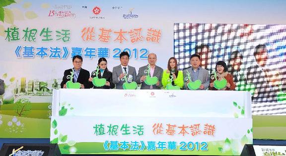 《基本法》嘉年華2012(一) 政制及內地事務局今日(十二月二日)下午於沙田大會堂廣場舉辦「《基本法》嘉年華2012」。圖示政制及內地事務局局長譚志源(左四)、《基本法》推廣督導委員會委員羅德慧(左二)、陳建強(右二)、黃均瑜(左一)、蔡關穎琴(右一)及《基本法》大使許志安(左三)和謝安琪(右三)主持開幕儀式。