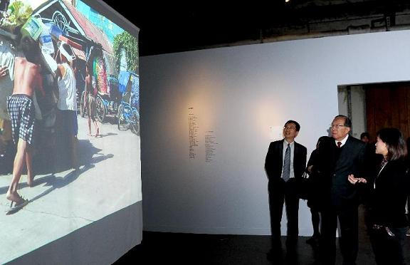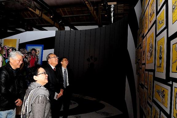 協進會」主席訪問台北(四) 李業廣(右二)在華山1914文化創意產業園,參觀「香港週」《身是客》當代藝術展。今年的「香港週」以「傳承與創新」為主題,透過一系列的展覽及藝術表演節目,向台灣民眾呈現人文薈萃、創意無限的香港。