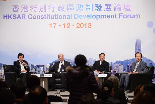 律政司司長和政制及內地事務局局長出席香江聚賢論壇(一) 律政司司長袁國強資深大律師(右二)和政制及內地事務局局長譚志源(左二)今日(十二月十七日)出席由香江聚賢主辦的論壇,就《二零一七年行政長官及二零一六年立法會產生辦法諮詢文件》和與會者交流。