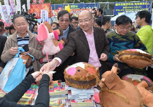 兩位局長與行會成員到維園農曆年宵市場(一) 政制及內地事務局局長譚志源、保安局局長黎棟國及行政會議成員林健鋒今日(一月二十六日)下午,在維多利亞公園為一農曆年宵攤檔主持開幕禮。