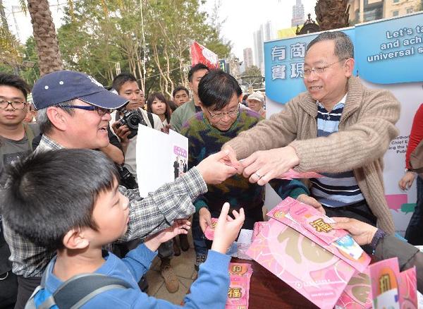 兩位局長與行會成員到維園農曆年宵市場(二) 黎棟國在維多利亞公園向市民派發宣傳單張及賀年揮春,呼籲更多市民就《二零一七年行政長官及二零一六年立法會產生辦法諮詢文件》發表意見。