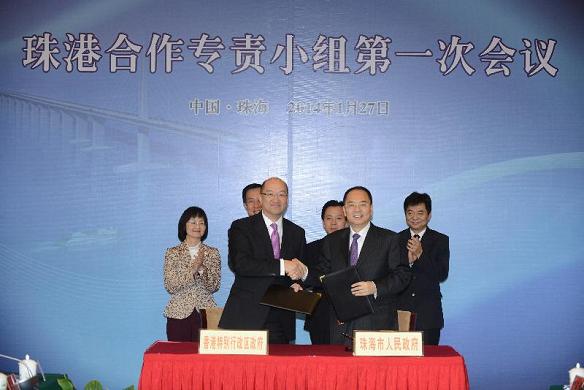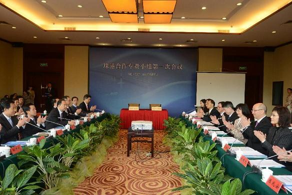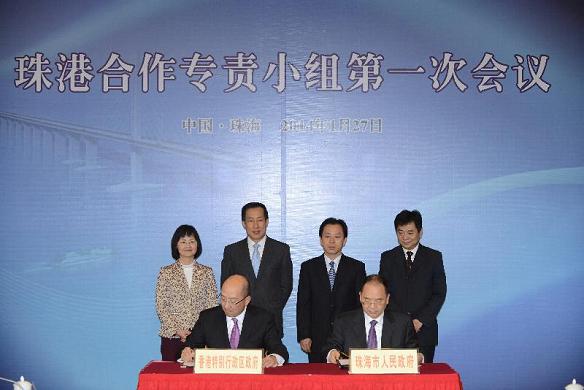 政制及內地事務局局長出席「港珠合作專責小組」首次會議(一) 政制及內地事務局局長譚志源今日(一月二十七日)上午率領特區政府代表團到珠海,出席「港珠合作專責小組」首次會議。圖示譚志源(右二)與珠海市市長何寧卡(左三)舉行會議。