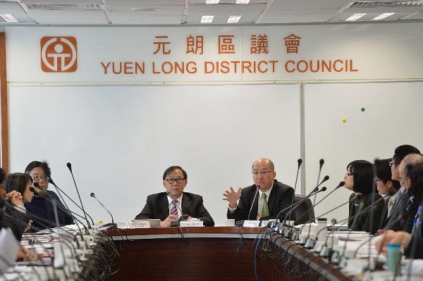 政制及內地事務局局長向元朗區議會簡介諮詢文件(一) 政制及內地事務局局長譚志源(右中)今日(二月二十五日)上午出席元朗區議會會議,向議員簡介《二零一七年行政長官及二零一六年立法會產生辦法諮詢文件》和聆聽他們的意見。