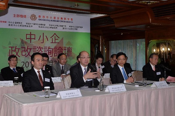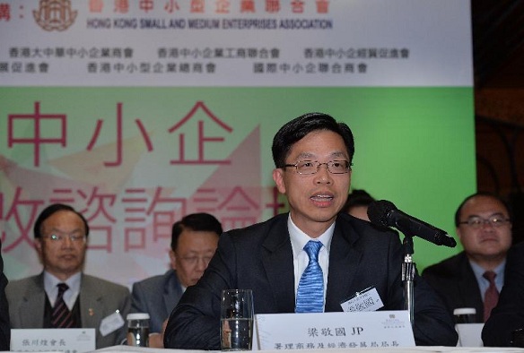政制及內地事務局局長和署理商務及經濟發展局局長出席香港中小型企業聯合會政改諮詢論壇(三) 梁敬國在論壇上發言。 |
