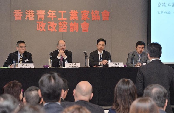 政制及內地事務局局長和商務及經濟發展局副局長出席香港青年工業家協會政改諮詢會(一) 政制及內地事務局局長譚志源(左二)和商務及經濟發展局副局長梁敬國(左三)今日(四月十五日)上午出席由香港青年工業家協會舉辦的政改諮詢會,就《二零一七年行政長官及二零一六年立法會產生辦法諮詢文件》和與會者交流。