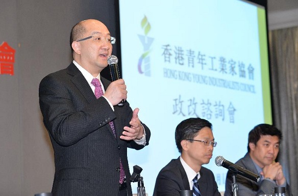 政制及內地事務局局長和商務及經濟發展局副局長出席香港青年工業家協會政改諮詢會(二) 譚志源在會上發言。 |